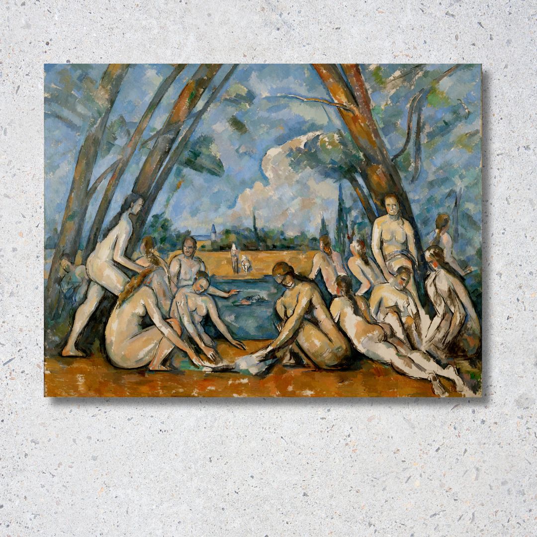 Tento rozsiahly obraz zobrazuje skupinu nahých ženských postáv v bujnej prírodnej scenérii, usporiadaných do harmonického a takmer architektonického celku. Cézanne tu vedome porušuje anatómiu a perspektívu, aby sa sústredil na štruktúru, objem a rytmus, čím vytvoril jedno z najvplyvnejších diel moderného umenia. Naša reprodukcia na plátne verne zachytáva dynamiku jeho ťahov štetcom a hru modrých, zelených a telových tónov, ktoré dodávajú scéne nevídanú plastickosť a hĺbku.