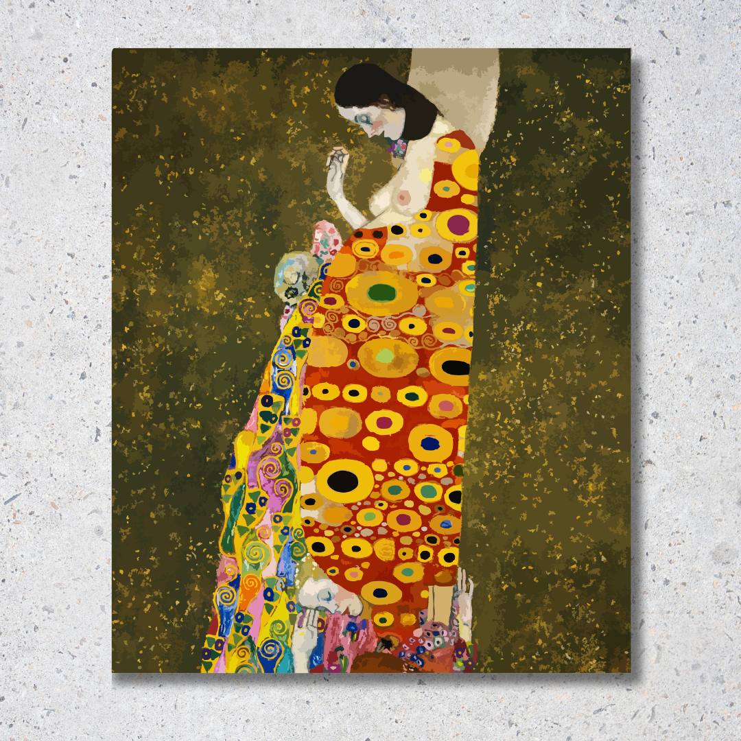 Tehotná žena, s hlavou sklonenou v modlitbe alebo zamyslení, je zahalená v bohato zdobenom rúchu, typickom pre Klimtov zlatý štýl. Obraz kontrastuje medzi životom a smrťou – krehká postava symbolizuje nádej a zrod, zatiaľ čo tiene pod ňou pripomínajú temné stránky existencie. Dielo je ukážkou Klimtovej schopnosti spájať ornament s hlbokou ľudskou emocionalitou a duchovným významom.