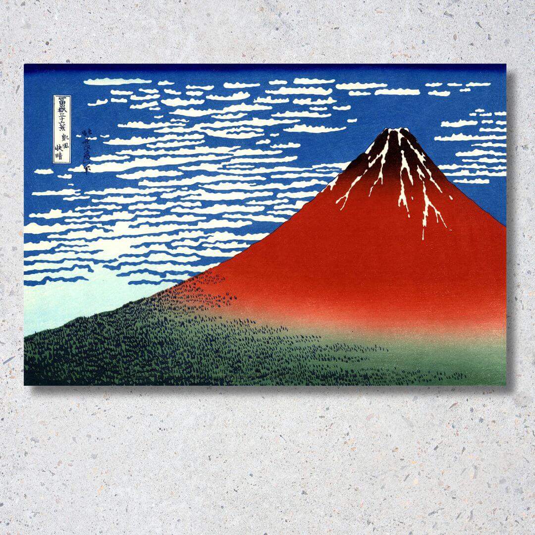 Kompozícia je geniálne jednoduchá: mohutný trojuholník hory zaberá väčšinu plochy, zatiaľ čo na modrej oblohe plávajú štylizované biele oblaky (v tvare „rybích šupín“). Na úpätí hory vidno miniatúrne tmavozelené lesy, ktoré podčiarkujú obrovskú mierku samotného vulkánu. Hokusai tu majstrovsky využíva techniku tieňovania (bokashi), čím dodáva plochej grafike hĺbku.