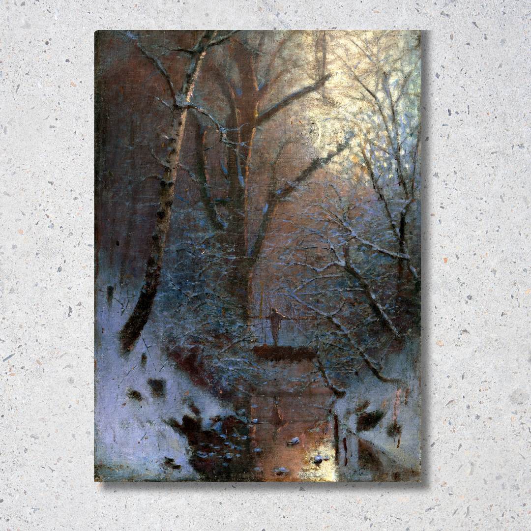 Krásny obraz od slávneho maliara Ladislava Medňanského. Zachytáva zimnú krajinu s potokom niekde v lese. Uprostred sa nachádza silueta postavy človeka, ktorá sa akoby strácala v prírode. Nad tým dominuje svit mesiac, ktorý bol obľúbeným motívom Medňanského. Originálny obraz pochádza z roku 1888.